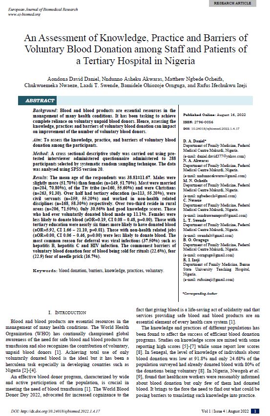 An Assessment of Knowledge, Practice and Barriers of Voluntary Blood Donation among Staff and Patients of a Tertiary Hospital in Nigeria