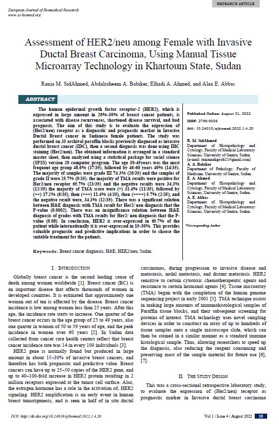 Assessment of HER2/neu among Female with Invasive Ductal Breast Carcinoma, Using Manual Tissue Microarray Technology in Khartoum State, Sudan